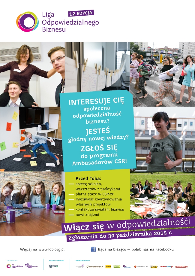 Do 30 października br. studenci zainteresowani tematem CSR (ang. corporate social reposnsibility - społeczna odpowiedzialność biznesu) oraz chcący rozwijać się w ramach programu Ligi Odpowiedzialnego Biznesu oraz mogą przesyłać swoje zgłoszenia. Rekrutacja odbywa się przez formularz dostępny na stronie: www.lob.org.pl